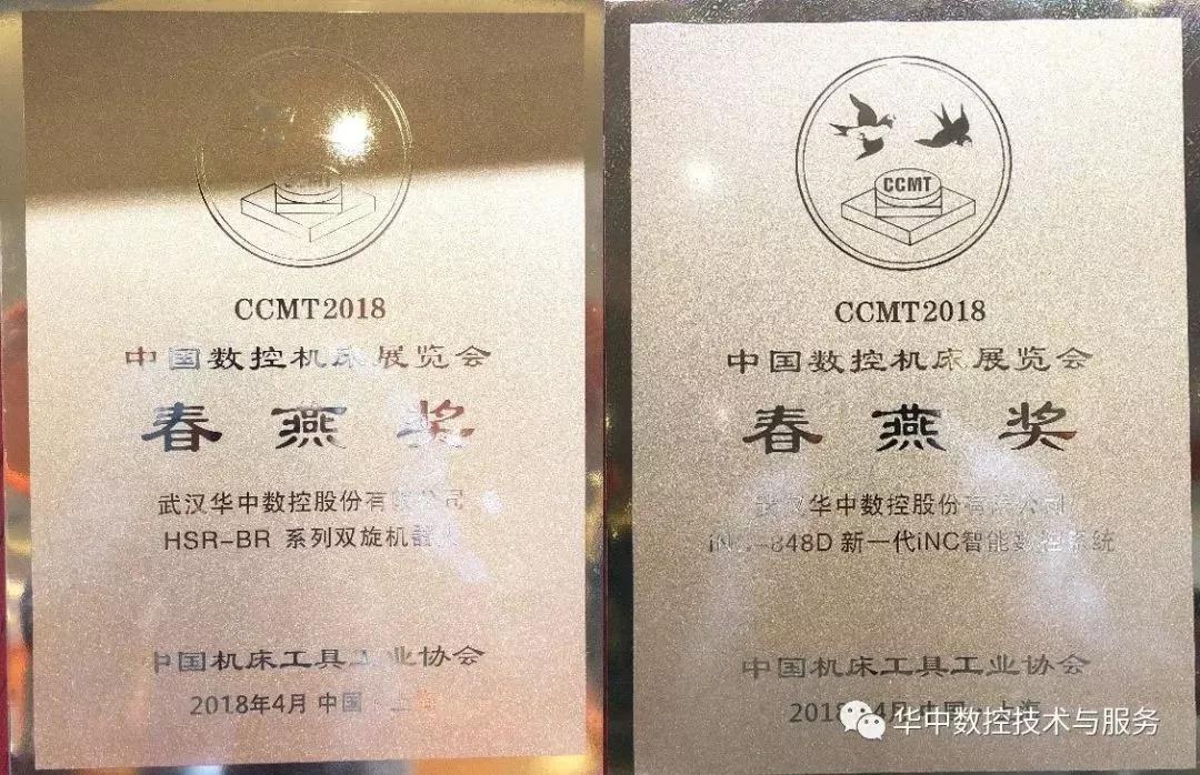 2018年4月9日下午,CCMT2018展會開幕當天,中國機床工具工業協會舉辦了“春燕獎”頒獎儀式。華中數控憑借iNC智能化數控系統和BR系列雙旋機器人兩項展品光榮入選CCMT2018春燕獎。