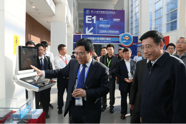 陳吉紅董事長向中國機械工業聯合會王瑞祥會長、中國機床工具工業協會常務副理事長毛予鋒、中國工程院原院長周濟院士等來訪貴賓介紹華中數控最新產品及技術